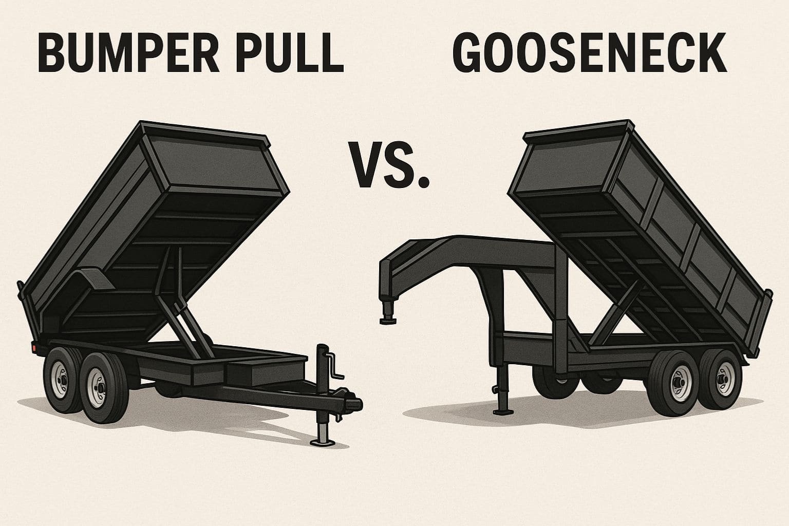 A bumper pull dump trailer connects to a hitch near the rear of your vehicle and is ideal for smaller loads and tighter spaces. A gooseneck dump trailer connects inside the truck bed, offering better stability, higher weight capacity, and is better suited for heavy-duty hauling.