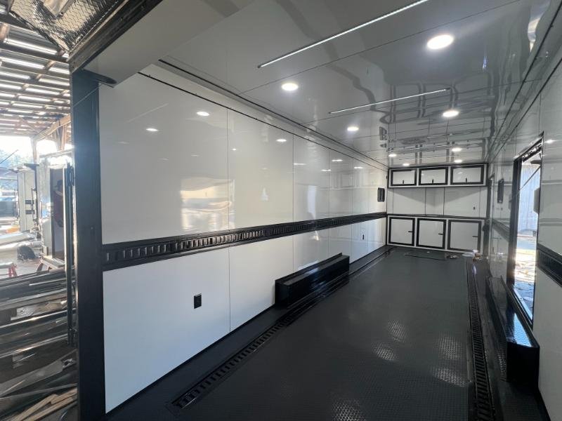 LED strip lighting runs the entire ceiling length—minimum 3,000 lumens for a 24-foot trailer.